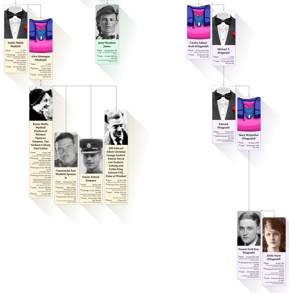 Common descent from Edward Dorsey and his wife Ann to Wallis, Duchess of Windsor, wife of the Duke of Windsor, Jesse James the outlaw and F. Scott Fitzgerald the novelist.