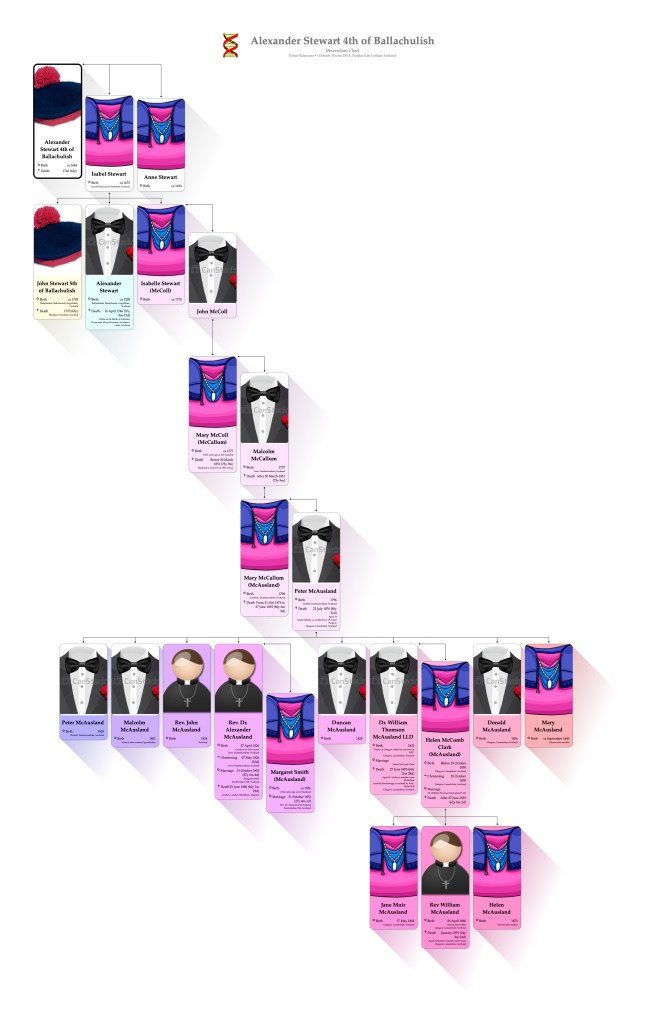 The tree below shows the family tree of the McAuslands from Alexander Stewart, 4th of Ballachulish, via his daughter Isabella, the great beauty mentioned in Donald MacLeod’s book, to her great grandsons, Alexander, John and William McAusland.