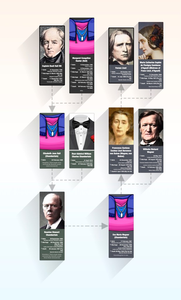 While looking at the extended family of Charles Darwin, I realised that Basil Hall’s grandson, Huston Chamberlain married Eve Wagner, the daughter of German composer Richard Wagner and granddaughter of Hungarian composer and pianist Franz Listz!