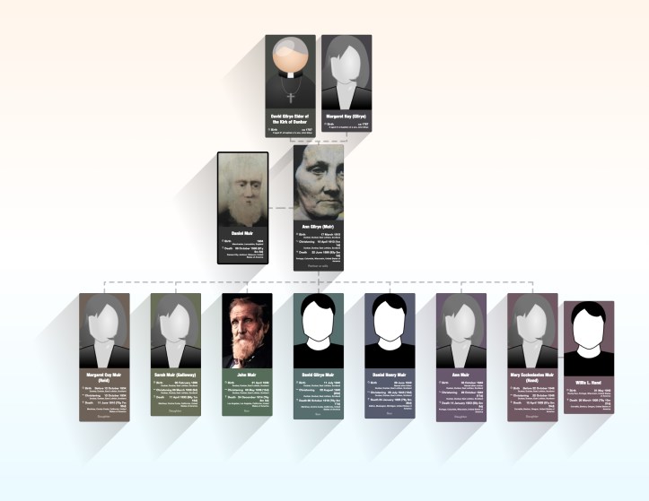 John Muir was the third of eight children: Margaret, Sarah, David, Daniel, Ann and Mary (twins), and the American-born Joanna. His earliest recollections were of taking short walks with his grandfather when he was three. In his autobiography, he described his boyhood pursuits, which included fighting, either by re-enacting romantic battles from the Wars of Scottish Independence or just scrapping on the playground, and hunting for birds’ nests (ostensibly to one-up his fellows as they compared notes on who knew where the most were located). Author Amy Marquis notes that he began his “love affair” with nature while young, and implies that it may have been in reaction to his strict religious upbringing. “His father believed that anything that distracted from Bible studies was frivolous and punishable.” But the young Muir was a “restless spirit” and especially “prone to lashings“. As a young boy, Muir became fascinated with the East Lothian landscape, and spent a lot of time wandering the local coastline and countryside. It was during this time that he became interested in natural history and the works of Scottish naturalist Alexander Wilson.