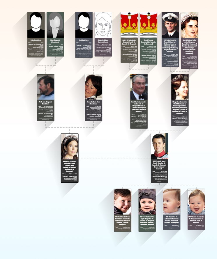 Our seventh cousin twice removed, Mary, Crown Princess of Denmark, Countess of Monpezat, R.E. (born Mary Elizabeth Donaldson 05 February 1972) is the wife of Frederik, Crown Prince of Denmark. Frederik is the heir apparent to the throne, which means that should Frederik succeed, she will automatically become Queen consort of Denmark.
