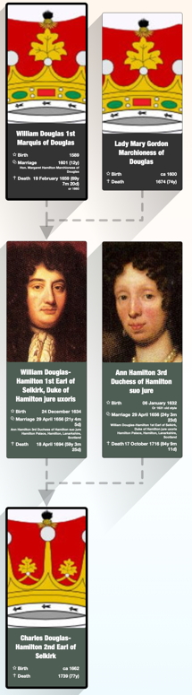 On 6 October 1688, during the reign of James VII, the new Duke of Hamilton surrendered his previous titles to the Crown (except Hamilton). They were reconferred on his third (but second surviving) son Charles Douglas, who thereby became 2nd Earl of Selkirk, and who also reverted to his original surname of “Douglas”. Thus, while the eldest son was to inherit the title of Duke of Hamilton and have his mother’s maiden name for surname, the younger son was to inherit his father’s dignities and perpetuate the name of Douglas.
