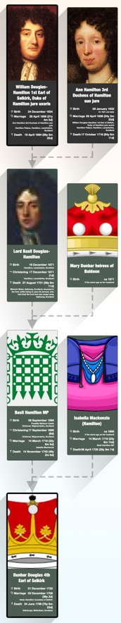 The Earldom of Selkirk and its subsidiary title, being limited to male heirs, passed to Dunbar Hamilton, grandson of Lord Basil Hamilton, sixth son of the 1st earl. Upon succeeding as 4th earl, he, like the 2nd earl, changed his surname to “Douglas”.