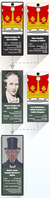 On the 4th Earl’s death in 1799, he was succeeded by his only surviving son, Thomas Douglas, Lord Daer, as 5th earl, who was then succeeded on his death in 1820 by his only son, Dunbar Douglas, Lord Daer, as 6th earl.