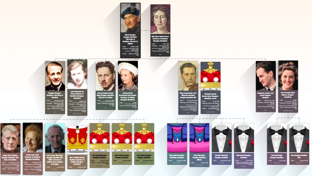 - if the titles were ever held by a duke of Hamilton (either because an earl of Selkirk succeeded as duke of Hamilton, or because provision 2 was unable to operate because the heir was a duke of Hamilton who had no surviving younger brothers), the titles would pass on that duke’s death to his second surviving son;