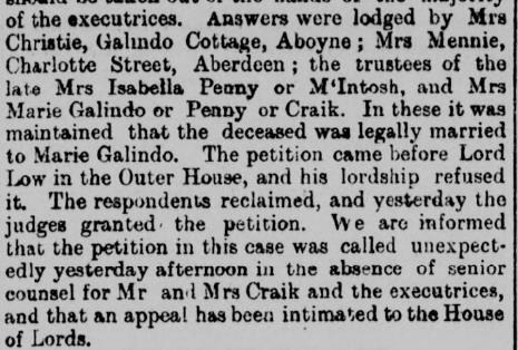 On 20th August 1891 Senora Maria Galindo de Penny was married to William Craik, a Scotsman, and on 12th September 1891 he, as in right of his wife’s whole estate under their marriage-contract, entered into an agreement with the agents of Mrs Christie and Mrs Mennie, by which they, as executrices and beneficiaries, withdrew their denial of the marriage of the late Andrew Penny, and agreed to accept £25,000 as in full of the claims of the next-of-kin.