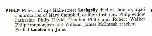 England & Wales, National Probate Calendar (Index of Wills and Administrations), 1861-1941 Record for Robert Philp, 29 June 1926.