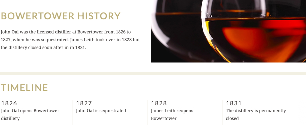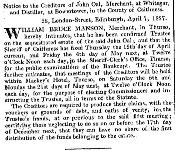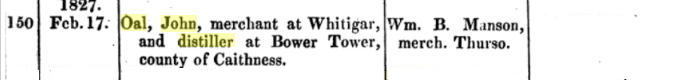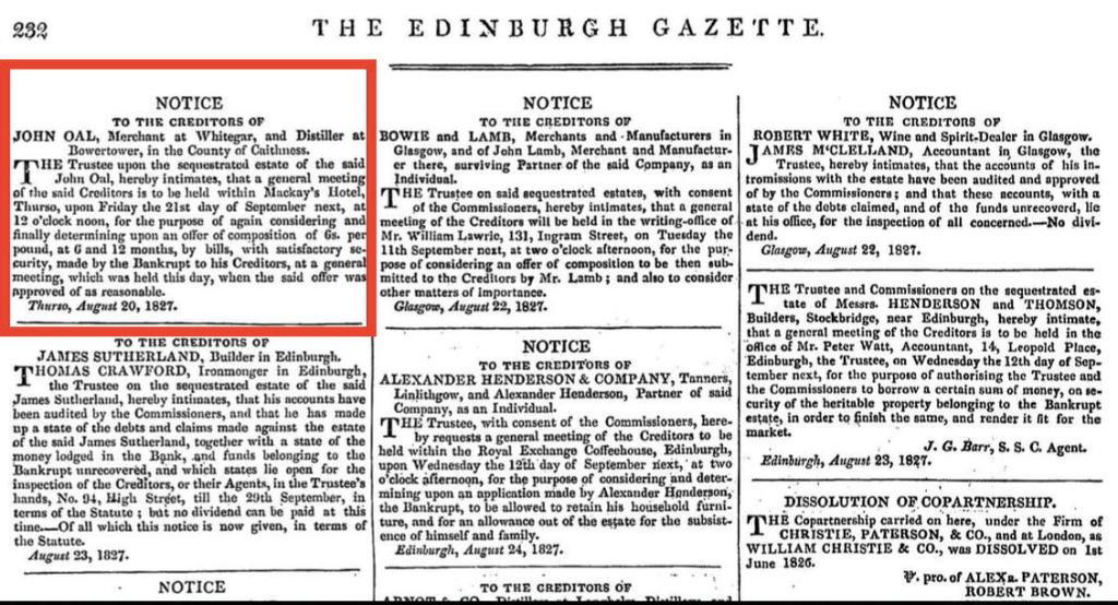 However Bowertower distillery did not prosper and on 17 February 1827, John Oal was sequestered. He was described as “Merchant at Whitegar” and “Distiller at Bowertower” in the London Gazette, in a notice to creditors.