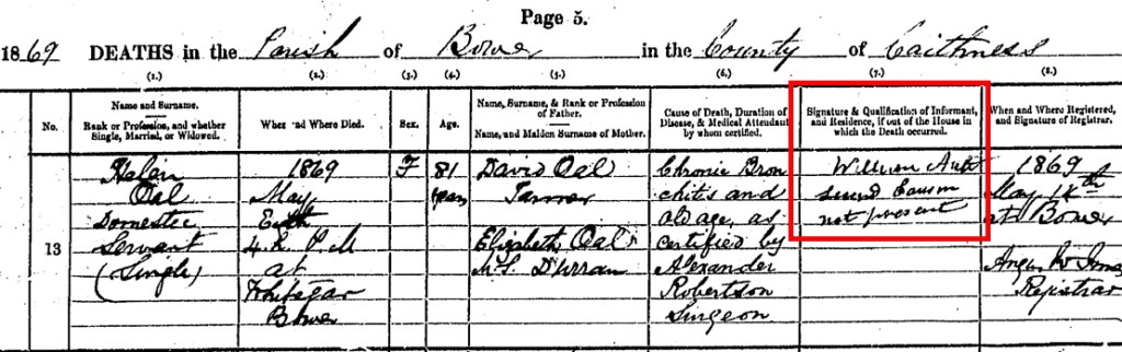 Our presumed relative John Oal was born at Halcro in the parish of Bower in Caithness on 12 August 1797 and baptised on 24 August 1797 with witnesses William Oal (presumably his paternal grandfather) and Hugh Manson (possibly his maternal grandfather or uncle.) It is believed that John may have been named after his maternal grandfather, whose identity is unknown.