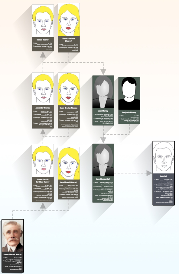 He was the second of the three sons of William Oal and Mary Manson, whose other children were William (born 09 March 1795 at Halcro), Wemyss (born at Halcro and baptised 24 August 1799) and Andrew, (born 01 April 1802 at Thura).
