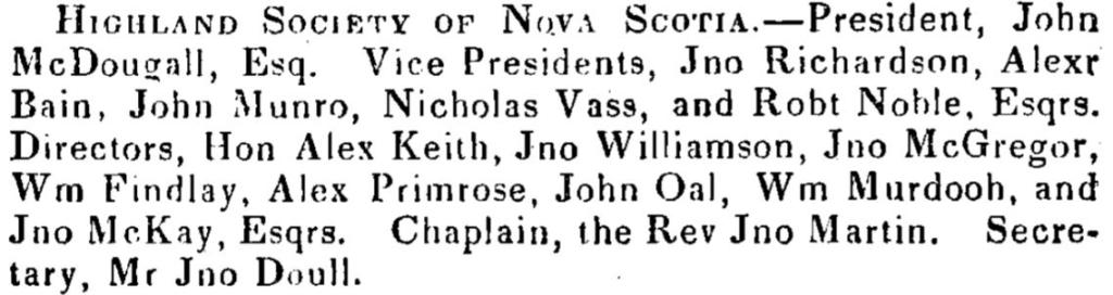 In 1851, John Oal was listed as one of the Directors of the Highland Society of Nova Scotia.
