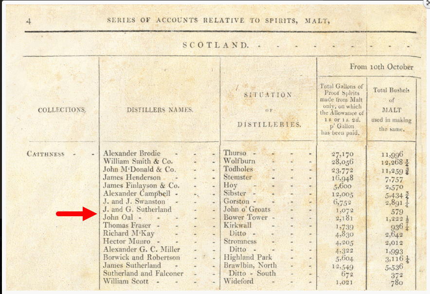 In 1826, John Oal obtained a licence for Bowertower Distillery. However, it seems likely that the distillery may have existed before this date as an illicit still. It is also not impossible that our own ancestors worked as coopers and distillers at this distillery.