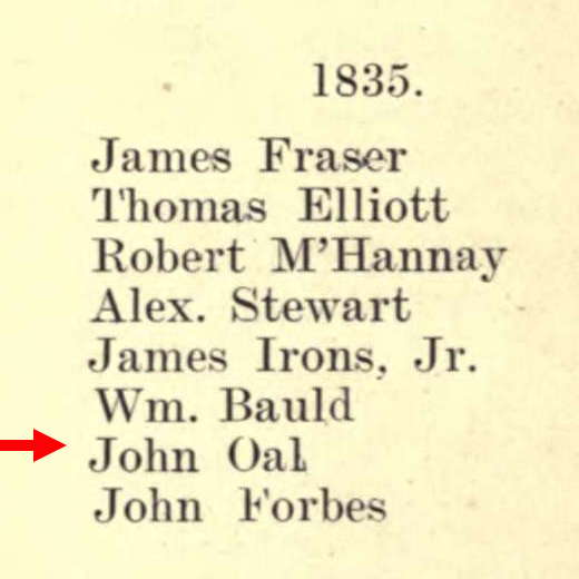 The next mention in the records of John Oal was in 1835 when he was listed amongst the new members of the North British Society in Halifax, Nova Scotia.