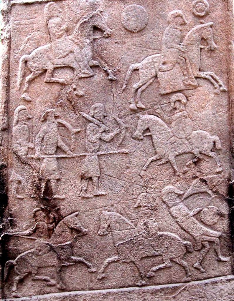 The battle scene inscribed on the Aberlemno kirk yard stone is often cited as evidence for the battle site. This interpretation was made based on the stone’s proximity to Dunnichen, only 3 miles (5 km) to the north, but while the short distance seems compelling, the stone is unlikely to be any earlier than mid-8th century, and the ornamentation of the stone, including the animal forms used and the style of weaponry depicted, suggests it may be as late as the mid-9th century. Prior to being linked with the Battle of Nechtansmere, the Aberlemno stone had been cited as evidence for the Battle of Barry (now known to be historically inauthentic), and there are a number of other possible interpretations for the carving.