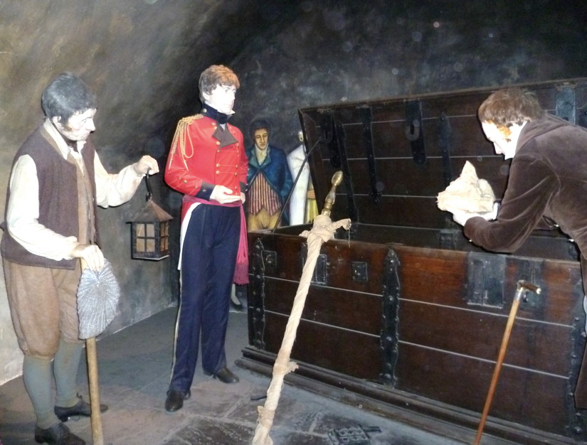There they remained, almost forgotten, until 1818 when the future George IV, acting as Prince Regent, issued a royal warrant authorising the historian Walter Scott and a group of officials to break down the wall of the ancient Crown Room on 4 February. Half expecting to find the oak chest empty, they were relieved to open it and discover the crown, sceptre and sword exactly as they had been left 111 years earlier. The Royal Standard was hoisted above Edinburgh Castle in celebration of the historic moment. Cheers of excitement rippled through the castle, and members of the public gathered outside to hear the news. On 26 May 1819, the Honours went on public display in the Crown Room. They were guarded by two veterans of the Battle of Waterloo dressed in a Tudor-style Yeoman’s outfit.