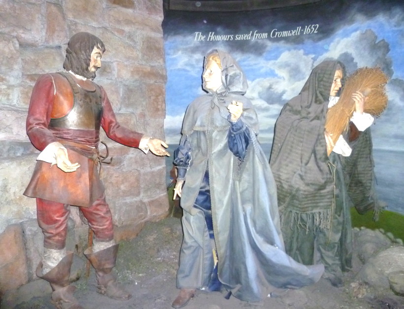 In 1651, during Cromwell’s occupation of Scotland after his victory at Dunbar in 1650, the regalia were quietly removed from the Castle to be used for the coronation at Scone of Charles II as King of Scots. From there they were taken for safekeeping to Dunnottar Castle, south of Aberdeen, smuggled out during a siege of that castle in 1652 and buried under the floor of a local church at Kinneff until the Restoration in 1660. The account of Christian Fletcher, wife of Mr. Granger, the minister of Kinneff, reveals how easily they might have been lost for all time, “…whereupon I went to Dunnottar, five miles distant from my house, and after a little conference with the said Elizabeth Douglas [the Governor’s wife], she showed me the Honours, desiring me to take upon me the keeping of them, and to carry them along with me, which I by the Lord’s assistance did willingly undertake, whereupon she delivered unto me the Crown and Sceptre*, which I brought with me on horseback, riding always near the sea along the tops of the high craigs, resolving rather to lose my life and throw them in the sea than that they should have taken them from me, being at that time in fear of the enemy always.” [* the Sword blade and hilt came out in a sack of flax carried by her servant].