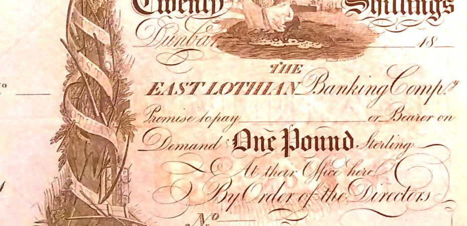The East Lothian Banking Company was founded in Dunbar in 1810. The £28,000 of the £80,000 capital paid up at the outset was subscribed by 56 people, mainly tenant farmers. The prime mover in the formation of the co-partnery was Christopher Middlemass [Middlemiss], merchant in Dunbar, who became chairman. Branches were established in Selkirk and Haddington and business was conducted via correspondents in Berwick, North Berwick, Edinburgh, London, Carlisle, Belfast and Glasgow. The Carlisle connection was especially important as it was used to circulate the company’s notes in the North of England. The cashier (manager) of the concern was William Borthwick. So much was he trusted that the supervisory responsibilities of the directors were often neglected and Borthwick was given a free hand in the administration of the bank. He abused this position by giving large loans to business ventures run by his brother and in which he was a secret partner. This led to his eventually decamping to America in 1822, following which the bank was wound up under a trust deed.