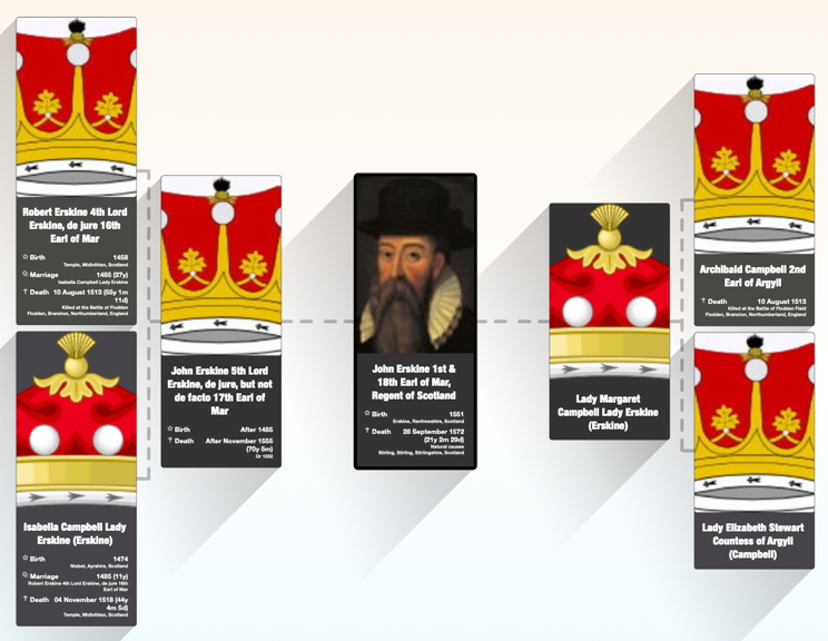 John Erskine, Earl of Mar (1571–1572) was a son of John, 5th Lord Erskine, who was guardian of King James V and afterwards of Mary, Queen of Scots. He was the maternal uncle of the Regent Moray despite being some twenty years younger than his nephew. He is regarded as both the 18th Earl of Mar (in the 1st creation) and the 1st Earl of Mar (in the 7th). He succeeded his father as 6th Lord Erskine in 1552 and in 1565 he was granted the earldom of Mar when Mary Queen of Scots restored the charter to him and his heirs “all and hail the said earldom of Mar.“