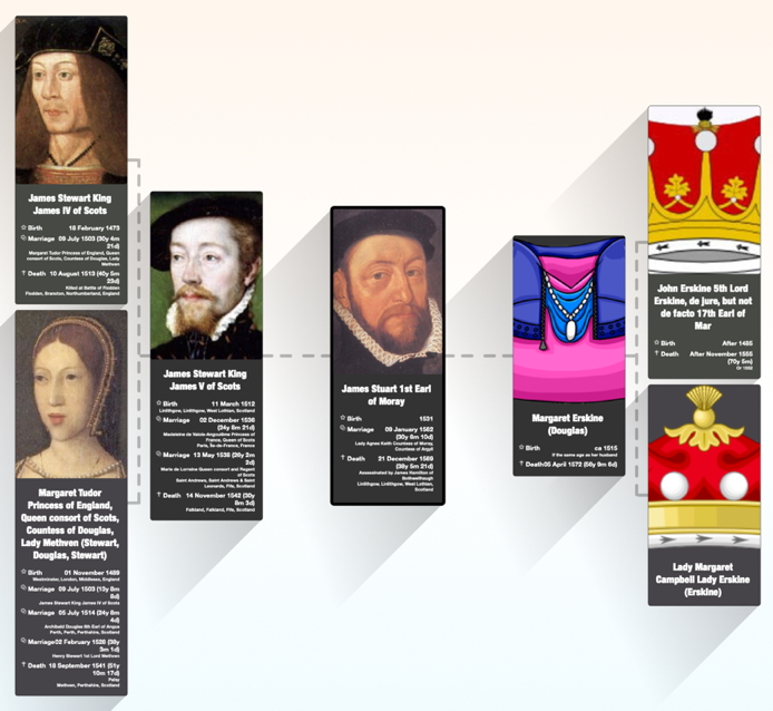 Before 1543 he married Elizabeth, daughter of James Douglas, 3rd Earl of Morton. In 1553 James Douglas succeeded to the title and estates of his father-in-law, including Dalkeith House in Midlothian and Aberdour Castle in Fife. Elizabeth Douglas suffered from mental illness, as did her two elder sisters, who were married to Regent Arran and Lord Maxwell. James and Elizabeth’s children did not survive to adulthood, except three daughters who were declared legally incompetent in 1581. James also had five illegitimate children.