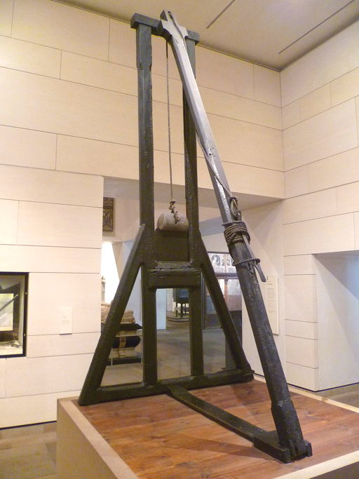 The person under sentence of death placed his head on a crossbar which is about four feet from the bottom. Lead weights weighing around 75 pounds (34 kg) were attached to the axe blade. The blade is guided by grooves cut within the inner edges of the frame. A peg, which is in turn attached to a cord, kept the blade in place. The executioner removed the peg by pulling sharply on the cord, and this caused the blade to fall and decapitate the condemned. If the condemned had been tried for stealing a horse, the cord was attached to the animal which, on being whipped, started away removing the peg, thereby becoming the executioner.