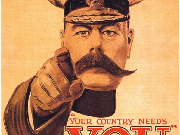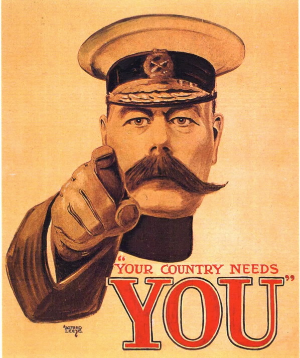 In 1914, upon the outbreak of World War I, Kitchener was appointed Secretary of State for War and was promoted to Field Marshal. Possibly the most iconic and enduring images of the war was the recruiting poster of Kitchen pointing with the text: