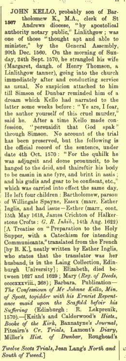 One person who seems to have slipped the attention of the author of the Statistical account was the Rev. John Kello who was appointed Minister of Spott parish in 1567. On 24 September 1570, he strangled his wife then calmly proceeded to church and conducted a service. On 4th October 1570 at the Gallow Lee on Leith Walk he was executed for the crime in a similar way to those convicted of witchcraft: he was hanged until death and then his body was cast into a fire and burnt. His “goods and gear” were also confiscated.