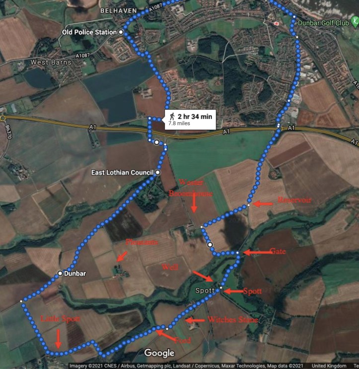 The Old Statistical Account for the parish of Spott states: “On the banks of all the burns are excellent springs. St John’s Well in the neighbourhood of the village of Spott is the most remarkable. It is carried in pipes 2 miles to Dunbar, for the supply of water to the inhabitants.”