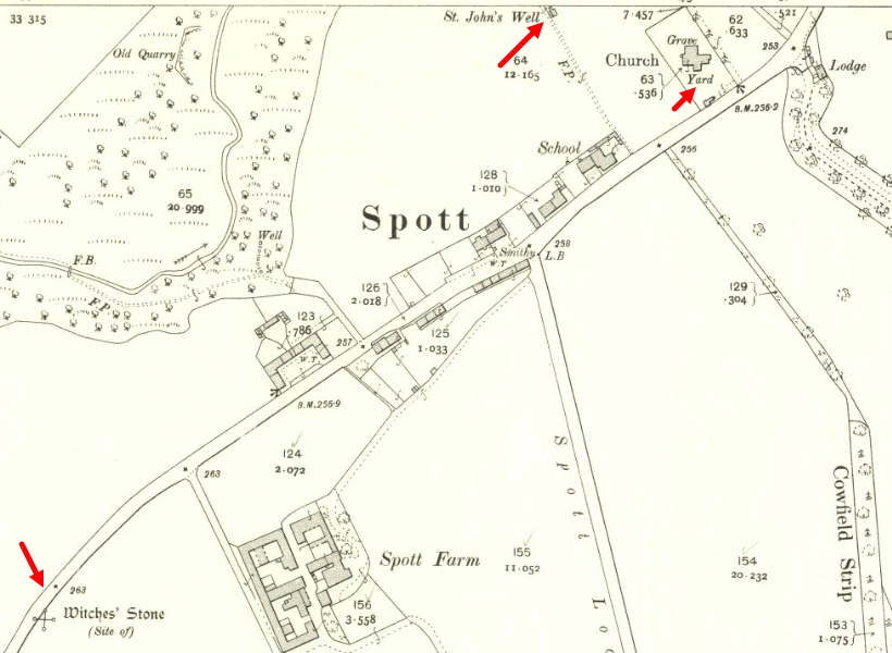 “There is a fine old holy well, dedicated to St John, 100 yds below Spott church.