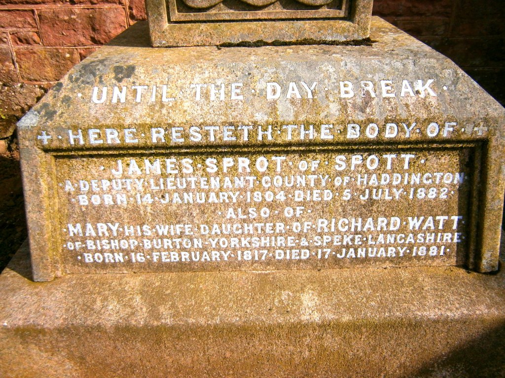 By foot, the gate, this time open, proved no obstacle to progress and I turned right up the Canongate and into the village of Spott. The origins of the current church are somewhat vague, but it is certain there was a church here before the Reformation, when Spott Kirk was a prebendary of the Collegiate Church of Dunbar. Major repairs were carried out on the church in 1790 and again the following century giving its present cruciform shape. One arm of the church is an ancient burial vault. In 1570 the minister, John Kelloe, strangled his wife in the manse before delivering ‘a more than usually eloquent sermon‘. He was executed on October 4 at Edinburgh at the Gallow Lee on Leith Walk for the crime. Patrick Simson, the Greek language expert, whose father was minister in Dunbar, preached here.