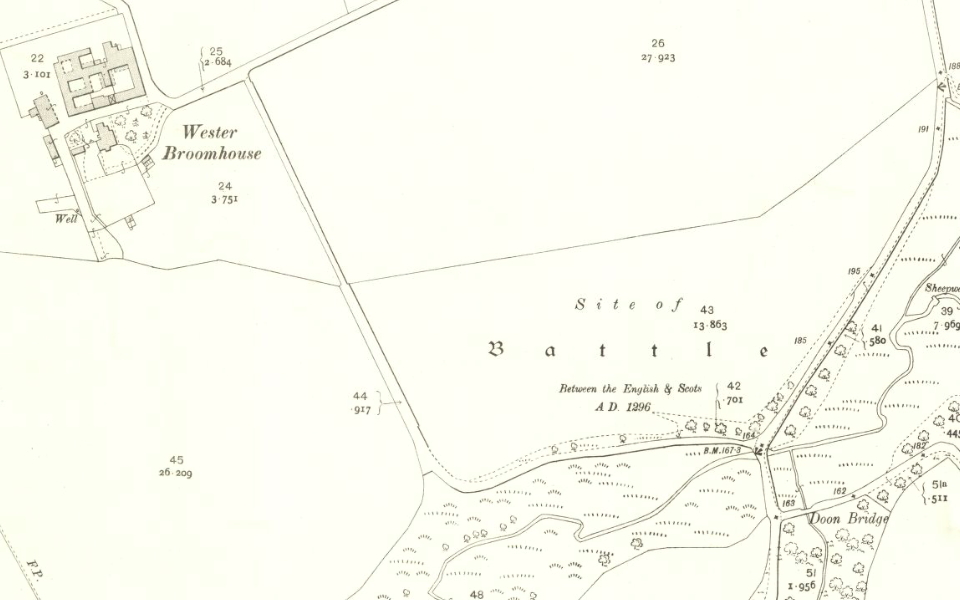 The lane from Wester Broomhouse to Doon Bridge lies beside the site of the 1296 first Battle of Dunbar – see map above.