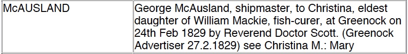 On 20 February 1829, George McAusland, shipmaster and Christina Mackie, both in the Old or West parish of Greenock booked their wedding and they were married on 27 February 1829. The marriage was announced in the Greenock Advertiser on 27 February 1829.