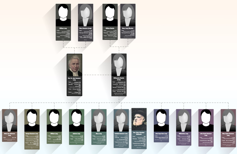 John Dunmore Lang (25 August 1799 – 8 August 1878) was the brother-in-law of our great (x4) uncle, Captain George McAusland, who participated in Lang’s Australian emigration project. Lang was a Scottish-born Australian Presbyterian minister, writer, historian, politician and activist. He was the first prominent advocate of an independent Australian nation and of Australian republicanism.