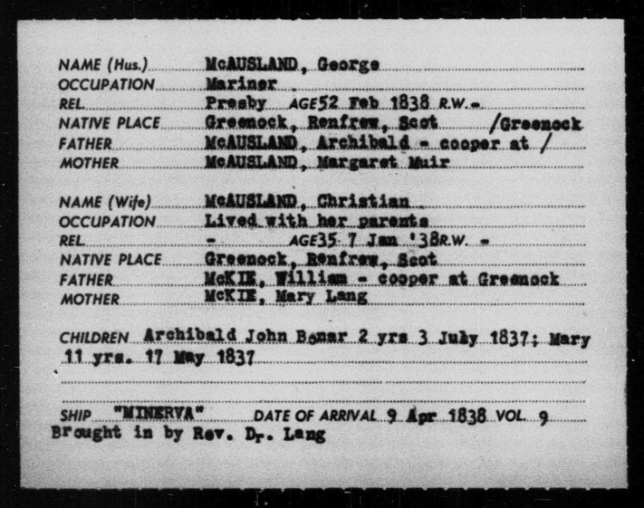 Archibald John Bonar McAusland was born on 03 July 1835 in the town of Greenock in Renfrewshire and baptised on 23 August 1835 in the Old or West parish. His parents were George McAusland, shipmaster and Christian Mackie – the sister-in-law of the Rev. John Dunmore Lang. He may have been named “Bonar” after the Rev J.J. Bonar of Greenock.