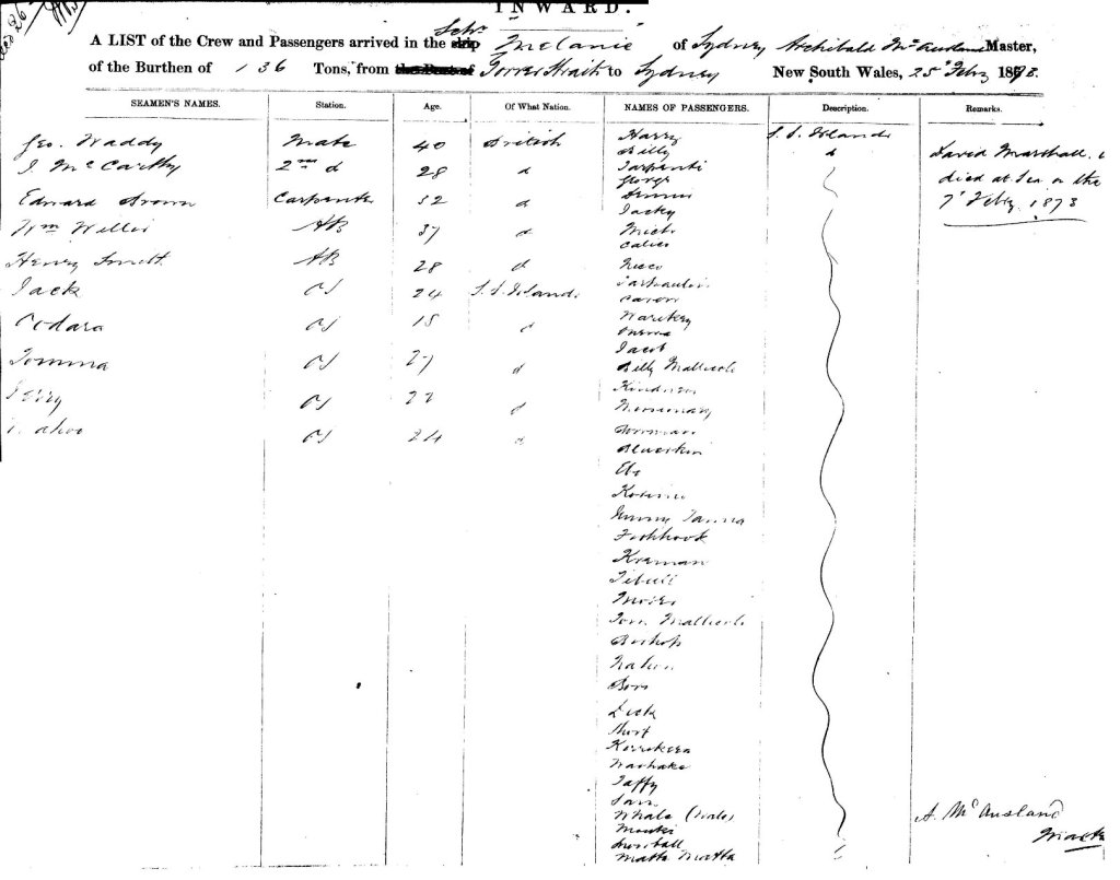 On 03 March 1869, the schooner Melanie arrived in Sydney from the T.S. (Torres Straits) Islands with Archibald McAusland, Master, a mate, second mate, a carpenter, a cook/steward and two Able Bodied and nine Island Seamen along with 46 passengers. The manifest noted that J. Lindeman, A.B. had been discharged at ______ Island on 30 November 1867, that Harry, A.B. had died at ______ Island on 2nd December 1868, and that James Solomon Johnson had been paid off at ___ _______ in January 1869.