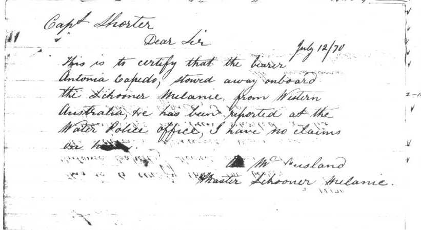 On 12 July 1870, Archibald McAusland wrote a letter to Captain Shorter concerning Antonia Capido, a stow away on the Melanie.