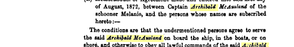 In 1873 there was a trial in the Vice-Admirality Court of New South Wales following the Melanie being seized by Captain John Moresby of HMS Basilisk regarding allegations of kidnapping. The seizure appears to have been the result of confusion, over-zealous policing and possible misinterpretation of a new law. The judgement was reported in the Sydney Morning Herald on Saturday 9th August 1873: