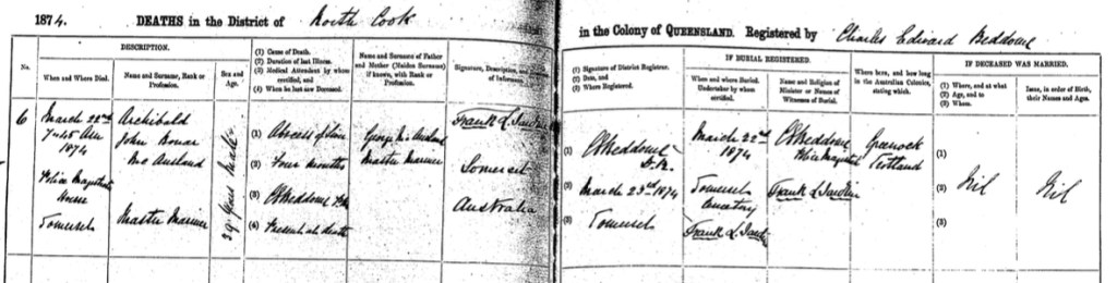 Sadly, Captain Archibald John Bonar McAusland died just six months after the court case, and six days before the release of the Melanie, on 22 March 1874. He was aged 39, unmarried at died at the Police Magistrate’s House at Somerset in Queensland. The cause of death was abces of liver, four months, as certified by C. Sheddow, Police Magistrate, who was present at at the death.