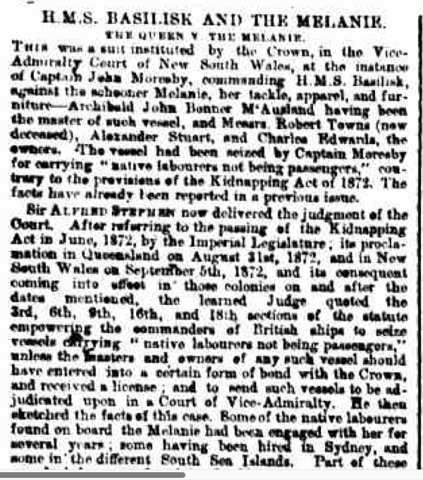 The seizing of the Melanie by Captain John Moresby and HMS Basilisk was reported in the Sydney Morning Herald of 3 July 1872: