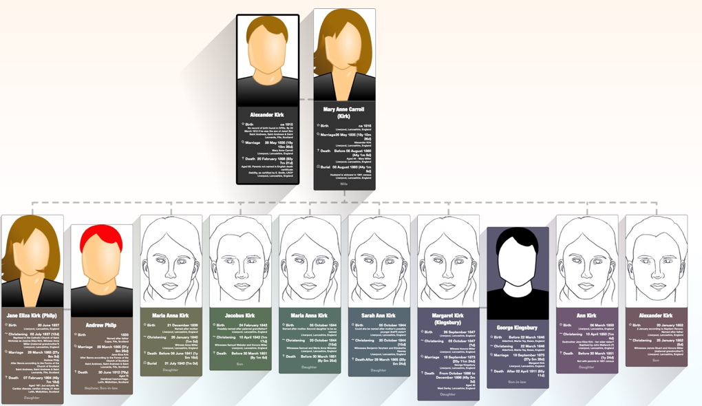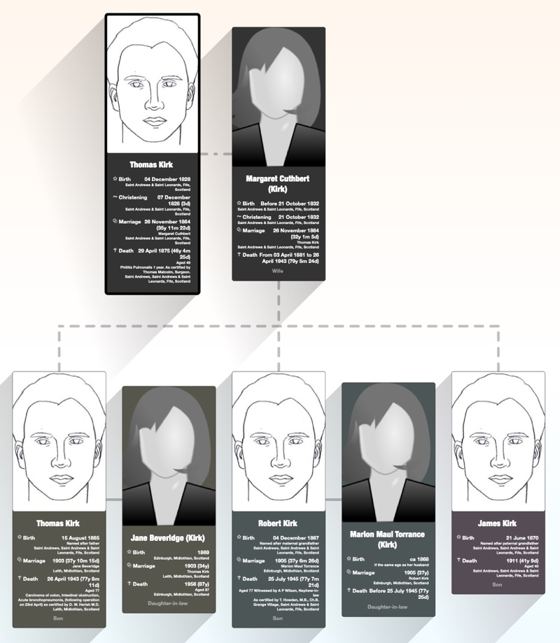 - Thomas Kirk, Head of the family, aged 43, Mason, born Saint Andrews.