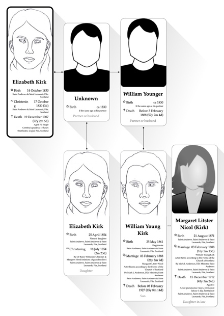 - Her unmarried daughter, Elizabeth Kirk, a House Servant, aged 20, born Saint Andrews.