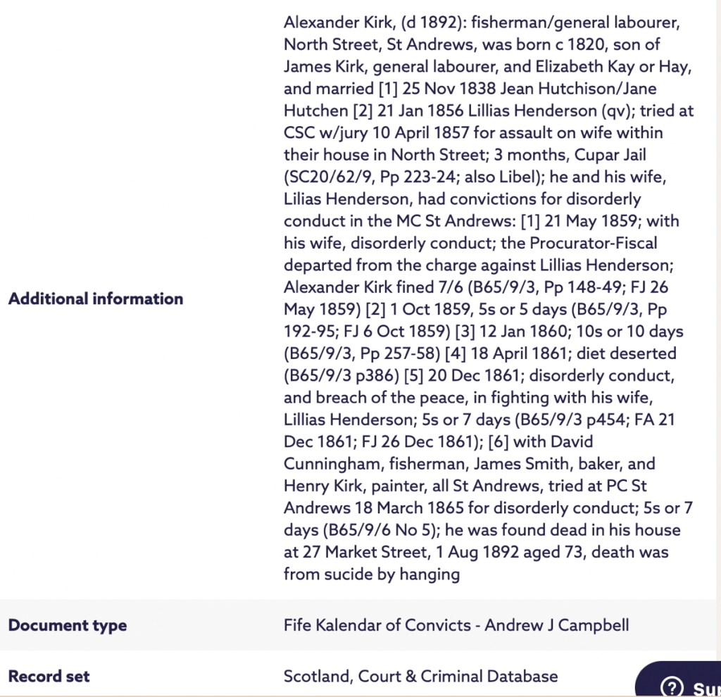 Alexander Kirk and his second wife Lilias Henderson appear to have had a stormy relationship with Alexander being fined several times for disorderly conduct and breach of the peace and also serving three months at Cupar Jail.