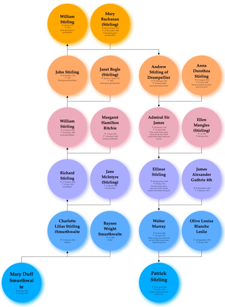 I was able to research the relationship of Mary Duff Smurthwaite and Patrick Stirling Guthrie and confirmed that they were indeed fourth cousins.