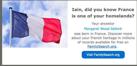 While Margaret Wood Selkirk may not have been born in France as FamilySearch claim, ironically, she was a French citizen, probably without knowing it, as were all Scots born before 1904 under the terms of the Auld Alliance.