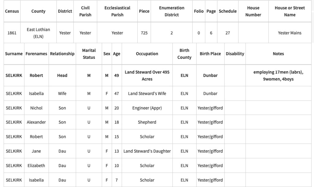 Also living at Yester Mains were some of those who presumably made up part of Robert Selkirk’s workforce of 17 men, 9 women and 4 boys: