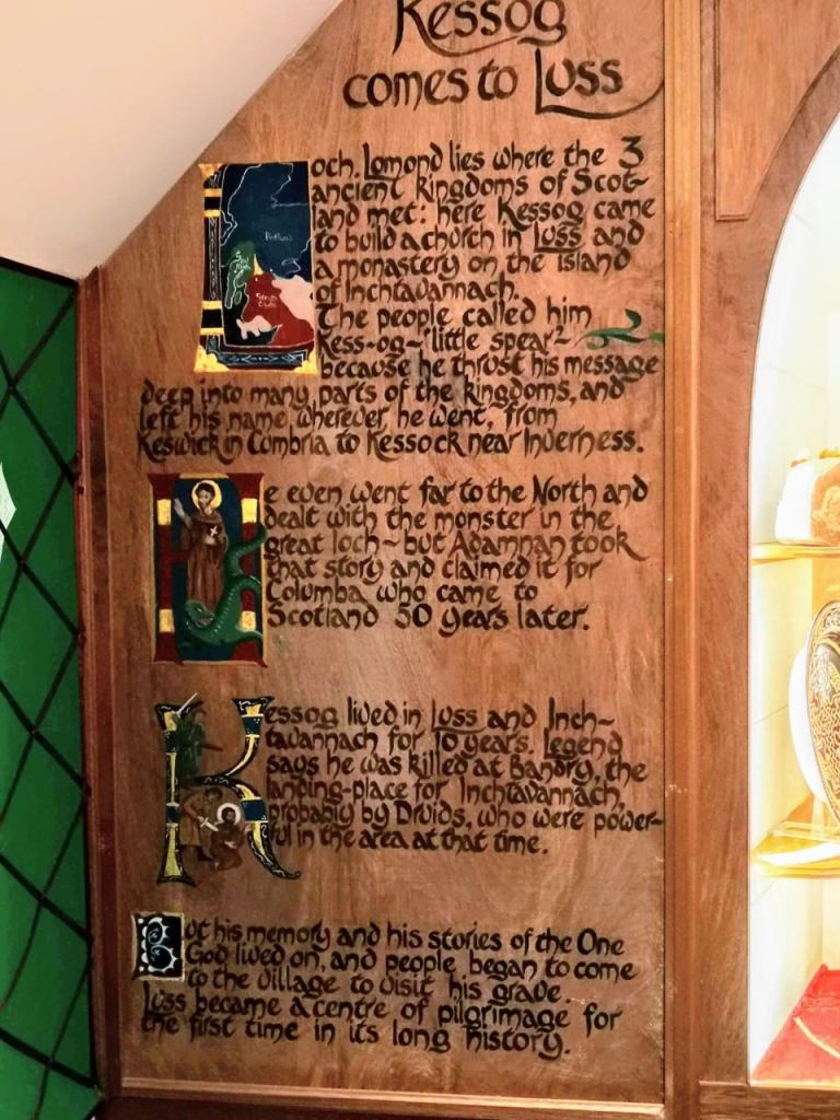 The following script is taken from pictures I took of 2 panels at the Heritage Centre in Luss , (where the TV series ”Take the High Road” used to be filmed), turns out some of the stories attributed to Columba, (Nessie for example), should be attributed to Saint Kessog:-