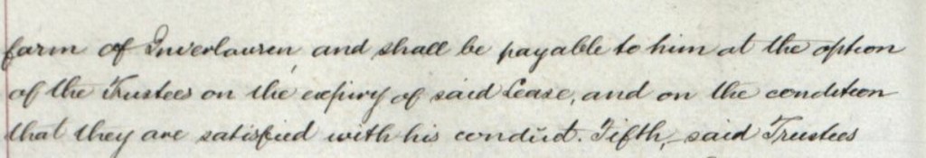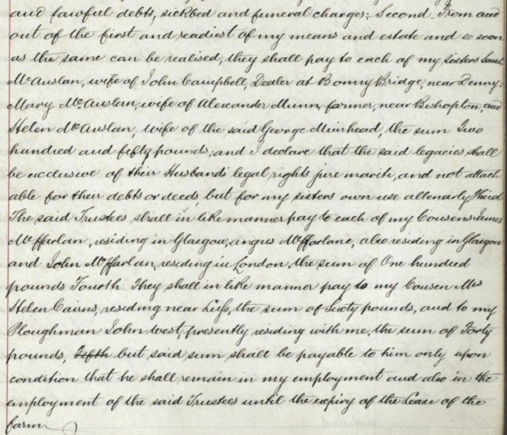 John McAusland also left, with conditions, the sum of £60 to his ploughman, John West. The conditions were that John West should remain in his employment and in the employment of of his trustees until the expiry of the lease of the farm, and that the sum would be paid up on the expiry of the lease, should the trustees be satisfied with his conduct. It is not known whether or not these conditions were fulfilled.