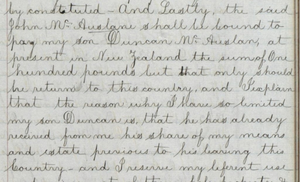 In his will, Humphrey McAusland left £100 to his second son Duncan, then resident in New Zealand, but only should he return to Scotland. He explained that this was because Duncan had already received his share of the estate prior to leaving Scotland.