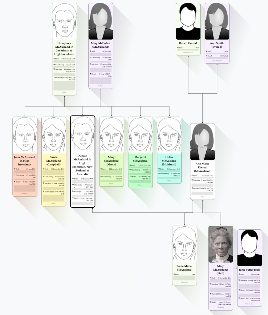 However, on 28 December 1859, Duncan had sailed from London and emigrated to New Zealand. Duncan seemingly went to manage a property called “Wairuna” which belonged to a George Steele who had gone to New Zealand in 1850. Duncan married Ann Evered, the sister of George Steele’s wife. Duncan McAuslan died on 22 July 1883 at Ingham, Hinchbrook, Queensland, Australia leaving two daughters, Anna Maria and Mary.