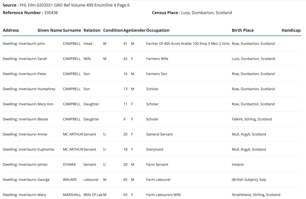 By 1911, Sarah McAuslan’s widower John Campbell was living at Inverlaurin Cottage with their daughter Bessie Walker Campbell. He was described as aged 73, a widower of independent means, while she was described as aged 24 and a housekeeper.