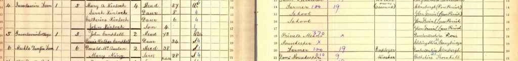 At the 1881 census, Inverlaurin was occupied by John Campbell, brother-in-law of the late John McAusland, along with his wife Sarah McAuslan and their family.